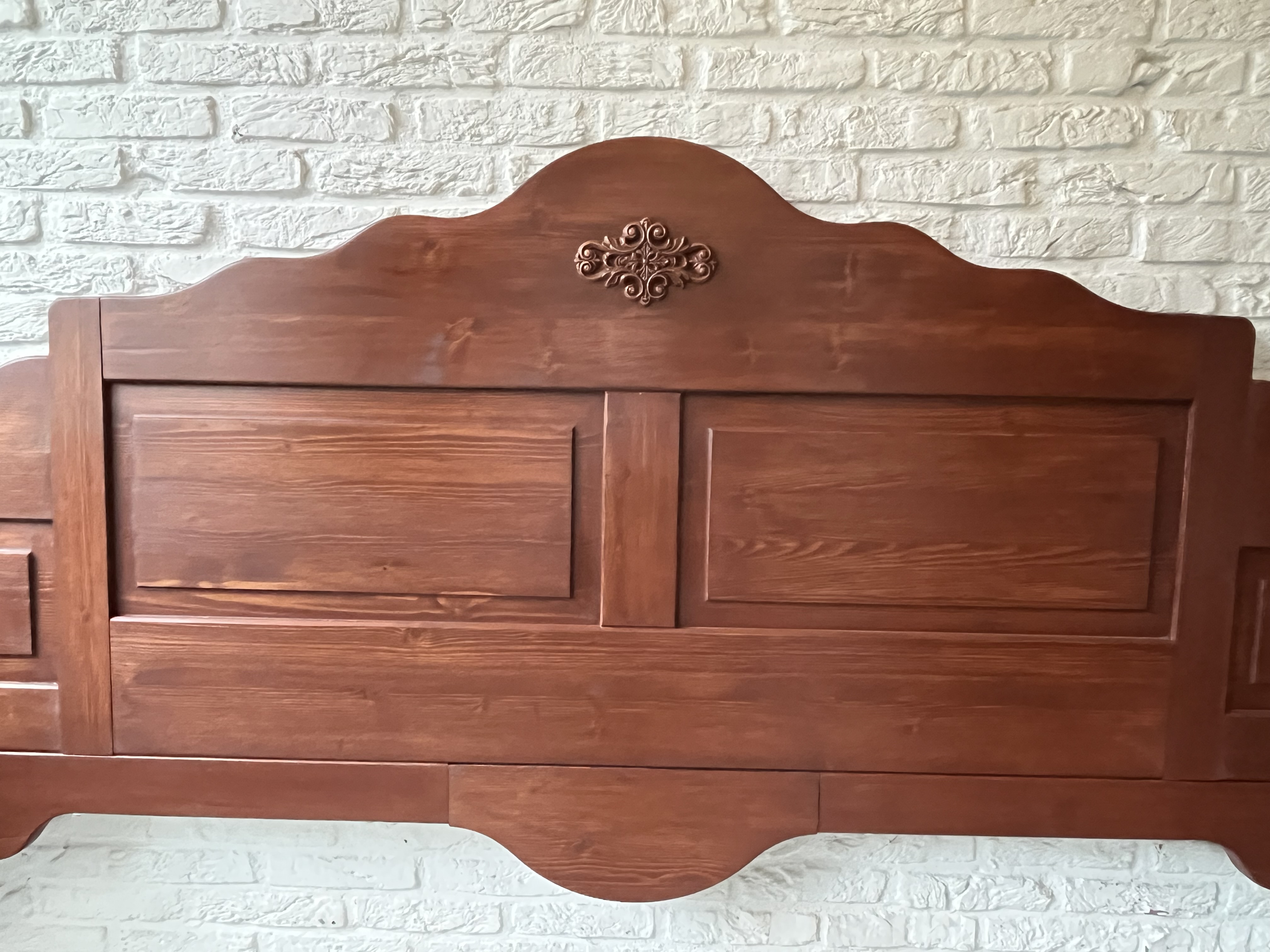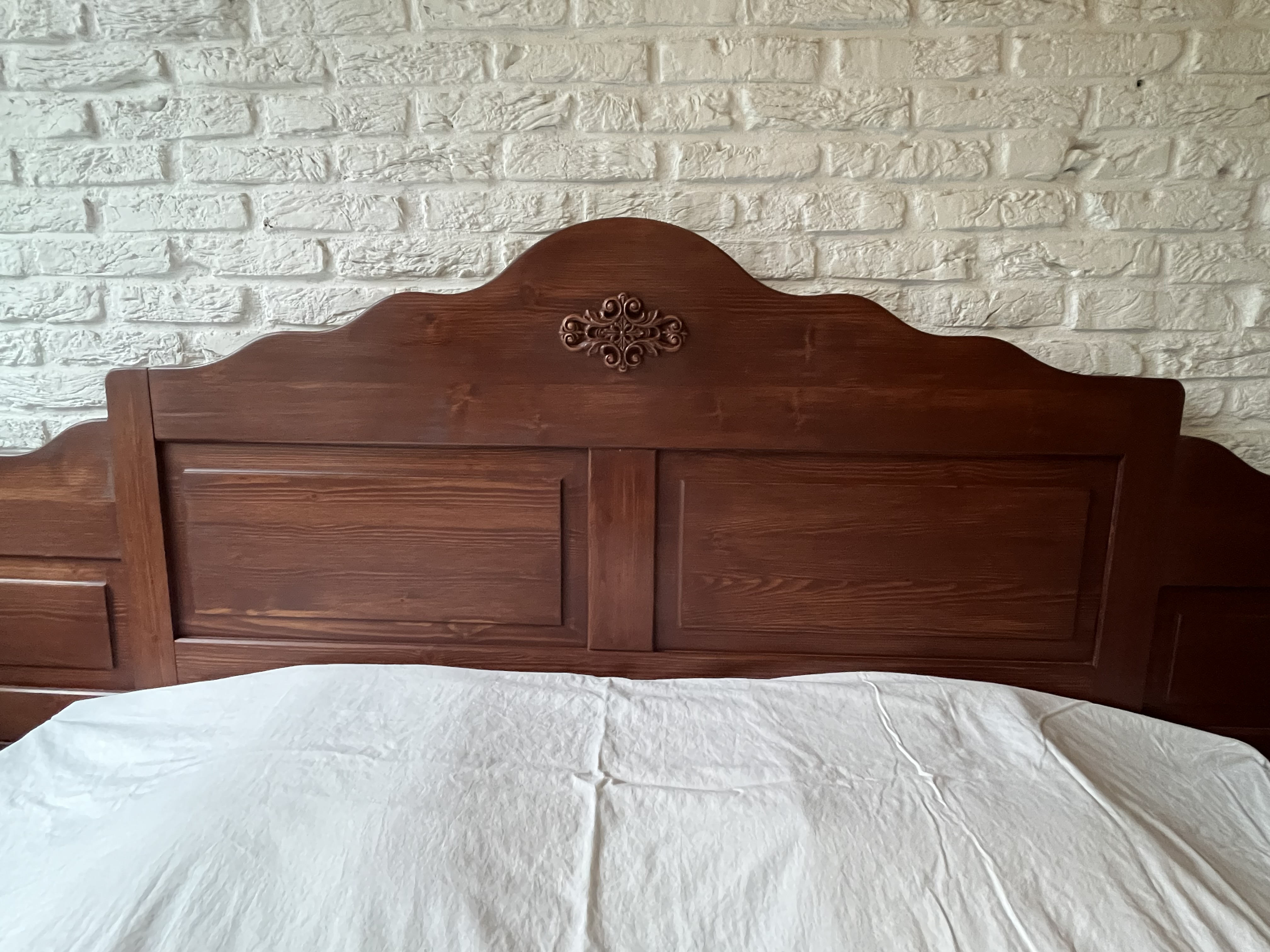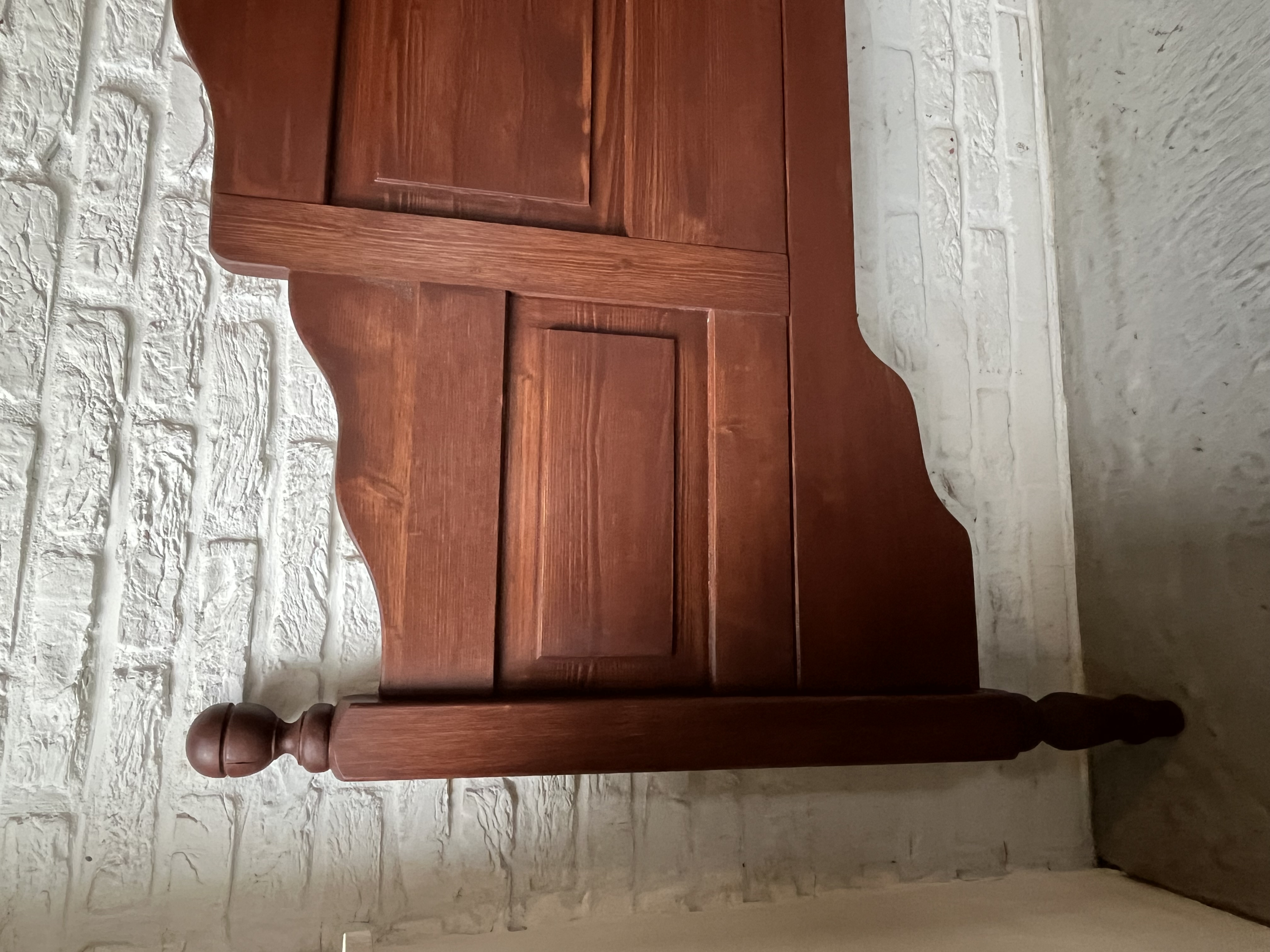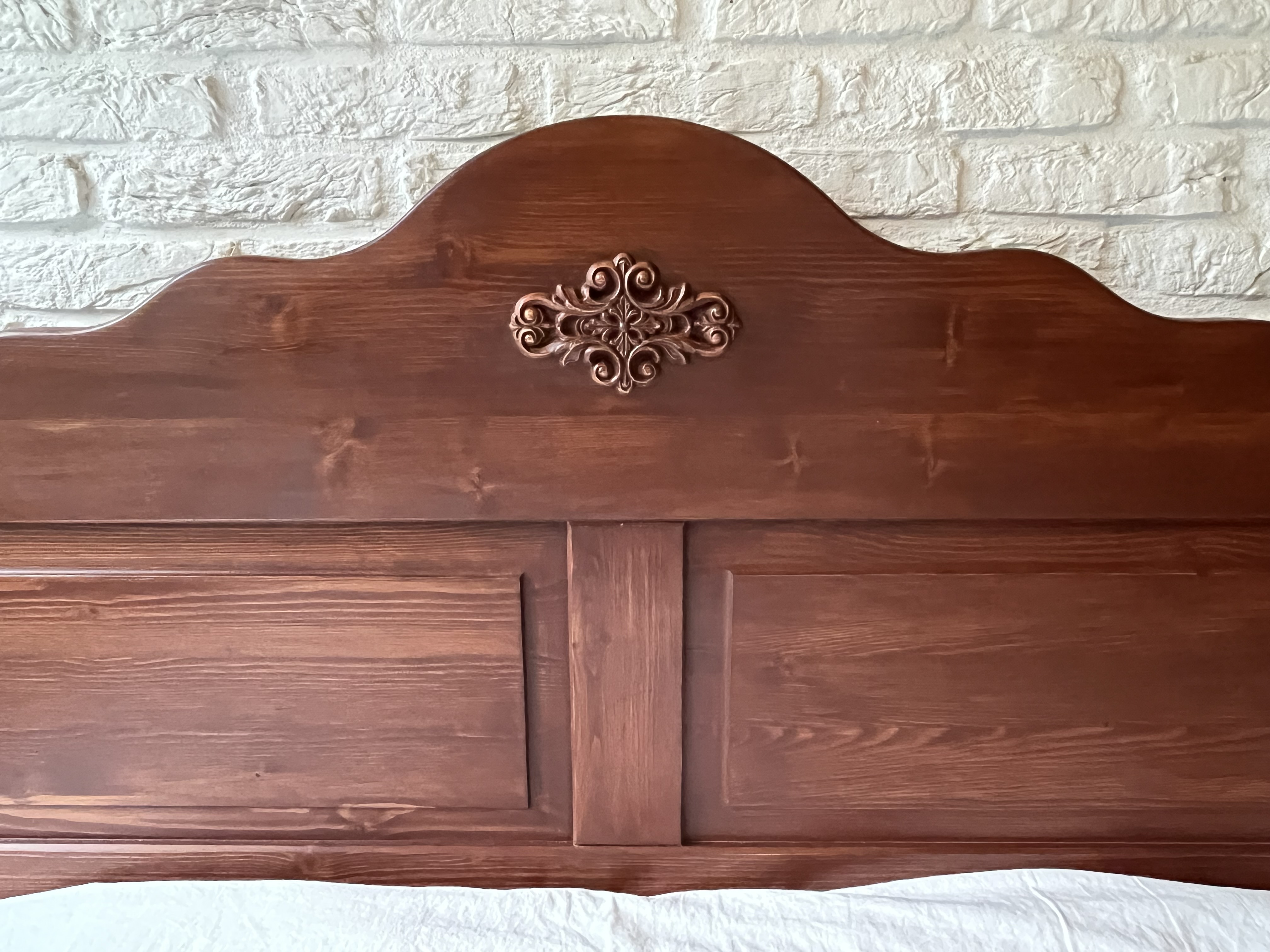 Een massief grenenhouten hoofdbord.